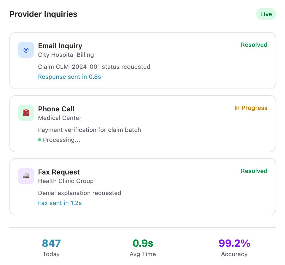 Give providers instant access to claim statuses via agents handling inquiries. Providers get answers instantly while your teams focus on higher-value work.