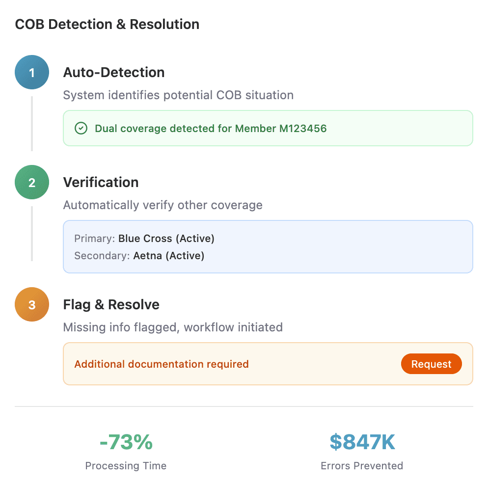 Detect COB situations, verify other coverage, and flag missing information. Cut COB processing time and eliminate costly payment errors.